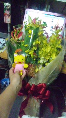 貰ったマスコットと花束!花束は、こんなん入る花瓶は家にないので、しばらく浴槽に浸かっててもらいます(笑)