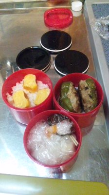 ピーマンの肉詰めは、冷凍のんが最後。昨日材料買ったから、今日作り足す!隙間がちっちゃかつぁたから、下に大根の細切りを引いてみた〜。あとは、梨と卵焼き。ケチャップソースはラップに包んで入れたのだ!