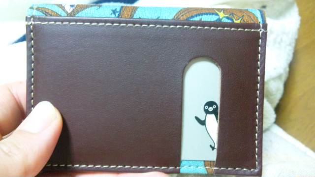 新しい定期入れキタ!背面にSuicaいれたら、Suicaペンギンが、狙ったかのようにハァイしてた(笑)