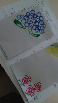 夏野菜ハンコで紫陽花とバラ〜☆