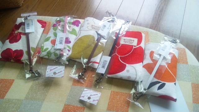 本体の柄を見ながら、持ち手の色を検討中。左から、茶、ピンク、茶、黒、白かな〜。