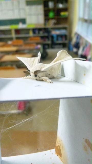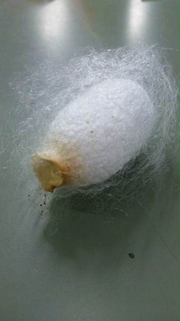 一つだけ置いといた繭から、カイコちゃんが出てまいりました☆良く見ると可愛いな〜と思うのですが…ダメかなぁ…(笑)
