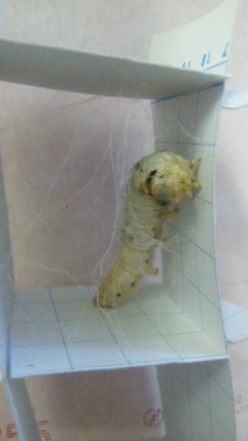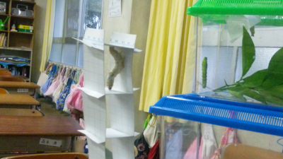 繭作り中の蚕ちゃんの横では、蛹になる場所を目指すべく、アゲハの幼虫も、糸を出して、壁を上ってますのこと。昆虫って不思議。