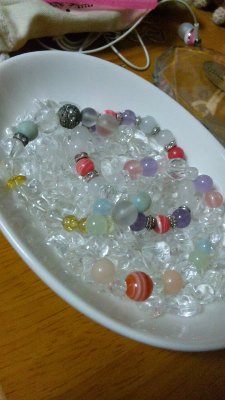 数珠ブレスを買ったお店で、水晶のさざれ石もサービスで付けてもらっちゃいました!小皿にのせて、お方づけ☆お守り感が増すね!