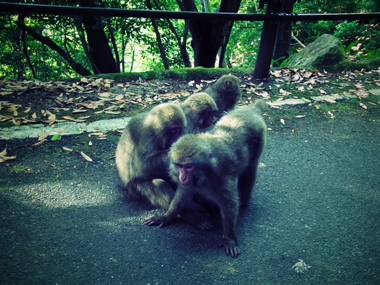 2つの滝を見た後は、西部林道という、世界文化遺産に指定された中を通る道路を通りました。途中で、猿と鹿に遭遇。どちらも全く人を怖がらず、車が近くで止まっても、ゆうゆうと毛づくろいをしていたりしました。ヤクザルは、ニホンザルより少し小さくて毛が長いらしいです。確かに、こぢんまりして、まるっとしてて、可愛かった!何より、表情が穏やかで、襲い掛かってきたりしないの!箕面や高崎山の猿とは大違い!!(笑)