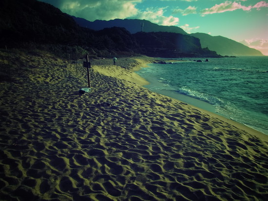 砂浜は、砂が粗くて、空気の通りが良いから、ウミガメの産卵地になっているそうな。産卵の時期は終わって、そろそろ、生まれた小亀が海に帰っていく時期なのだそうです。残念ながら、小亀には会えませんでした。まぁ、出てくるのはよるらしいので仕方ない!