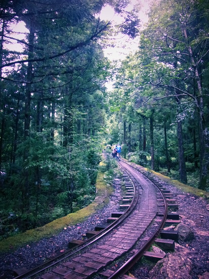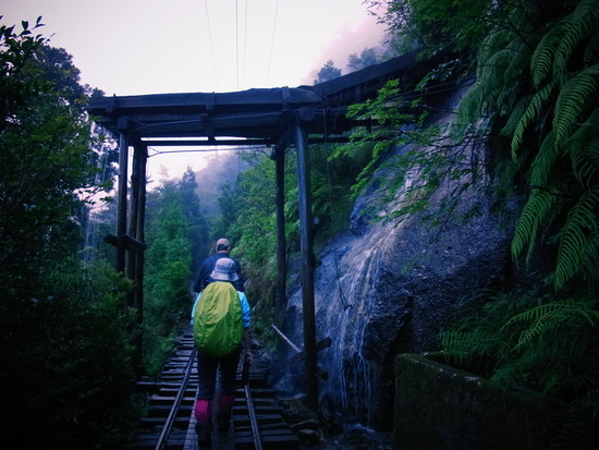 歩き始めてしばらくは、トロッコ道を延々歩いていきます。このトロッコ道、現役らしく、ごくまれに、歩いている最中に後ろからトロッコがやってくることがあるそうな。トロッコ道を歩く間も、パラパラと雨が降ってきていて、傘をさしながら歩きました。雨は、パラパラ降ったり、時々止んだり、時々猛烈に降ったり、というカンジ。9人で歩いているのと、前にも後ろにも別のグループがいるので、ナカナカ写真は撮れず、もくもくコツコツ歩きました。