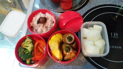 久々なので、好きなものばっかり詰め込んだった!(≧∀≦)豚バラのネギ巻き、パプリカのオイスターソース炒め、ブロッコリーのナムル風に、卵焼き!