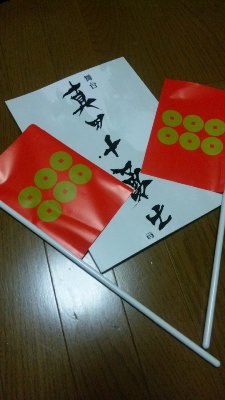 前に見に行った、真田十勇士は、千秋楽だったので、旗が渡されて、カーテンコールでバタバタ振ったよ!(笑)