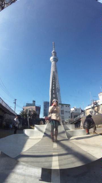 凸面鏡で、スカイツリーと一緒に写ったよ!
