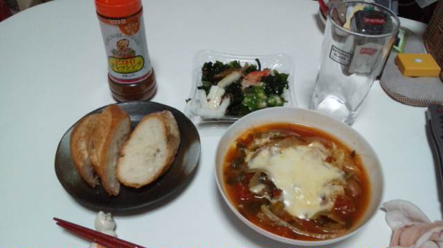 晩ごはんの、トマトスープ☆クックパッドのトマト鍋にセロリを投入して、トマトスープにして、パンと食べたー。