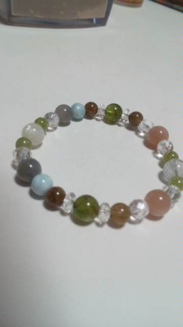 パワーストーンブレスを自作してみました!スーパーセブン、オレンジムーンストーン、ペリドット、ルチルクォーツ、ラリマー、ラブラドライト、、アクアオーラ、ムーンストーンで作りましてん!色々ぶっ込んだ(笑)