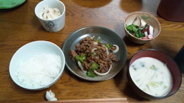 今日は余裕あったから、一汁三菜出来た〜(*´∇`*)まぁ、メインが味付け肉炒めただけですがな!(笑)