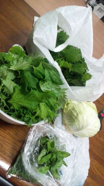 職場の畑での収穫物。青虫用に植えたキャベツが、ちっちゃいながら出来たので、収穫!