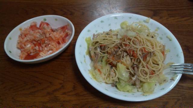 こないだ作ったオイルサーディンのパスタと塩玉ねぎをトマトにかけたサラダ☆