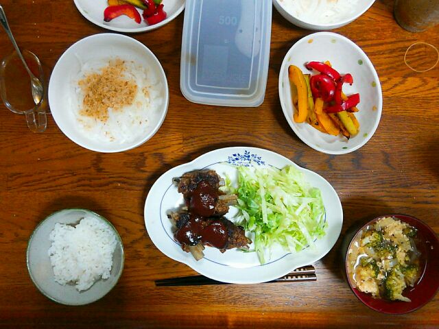 晩御飯に、ハンバーグのゴボウ巻き。新玉ねぎには、昨日の漬けマグロの残りダレと、鰹節をかけていただきました☆