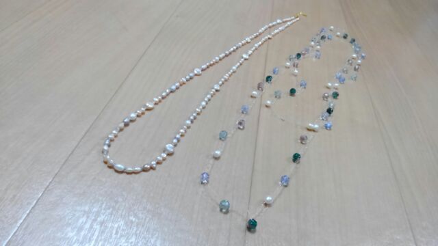 最近の製作物。超ロングの、チェコビーズのテグス編みネックレスと、淡水パールのロングネックレス(*´ω`*)淡水パールのんは、二重にしたら、ちょっとエレガントな感じ~(*´ω`*)