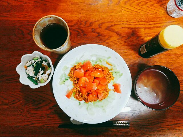 今日の晩御飯は、冷凍のタコライスとネギとささみのザーサイ和え!