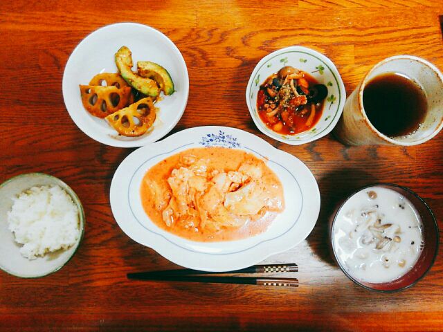 今日の晩御飯は、鶏の豆乳キムチ蒸しとキノコスープ他。