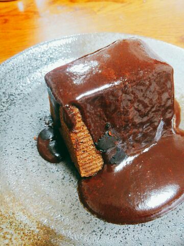 とろけたチョコソースに、ふわふわのチョコバウムクーヘンを絡めて食べるの、ウマーでした(*´ω`*)