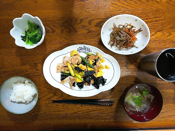 今日の晩御飯は、キクラゲとアスパラと豚肉の中華炒め、三つ葉のお浸し、きんぴらごぼうと、豚肉とネギの中華スープ。そろそろ、冷蔵庫の中身を整理しなきゃ~!