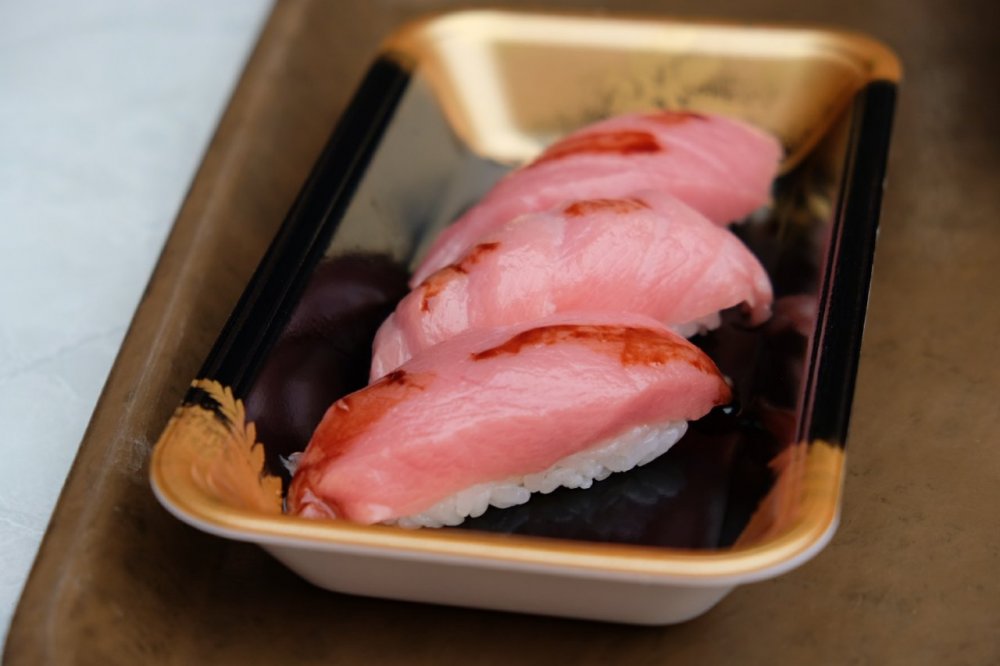 黒潮市場では、マグロの解体ショーを見て、大トロ食べたよ!あ。1貫だけ、ね。