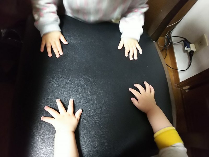 一歳半違いの従姉妹と、手の大きさがほぼ同じでした。うちの坊やが手前。