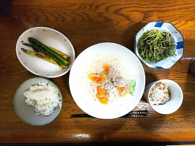 今日の晩御飯は、塩豚のスープ、豆苗と塩昆布のナムル、アスパラの塩焼き、納豆でした!アスパラが、焼いただけやったけど甘くて美味しかった~(*´ω`*)