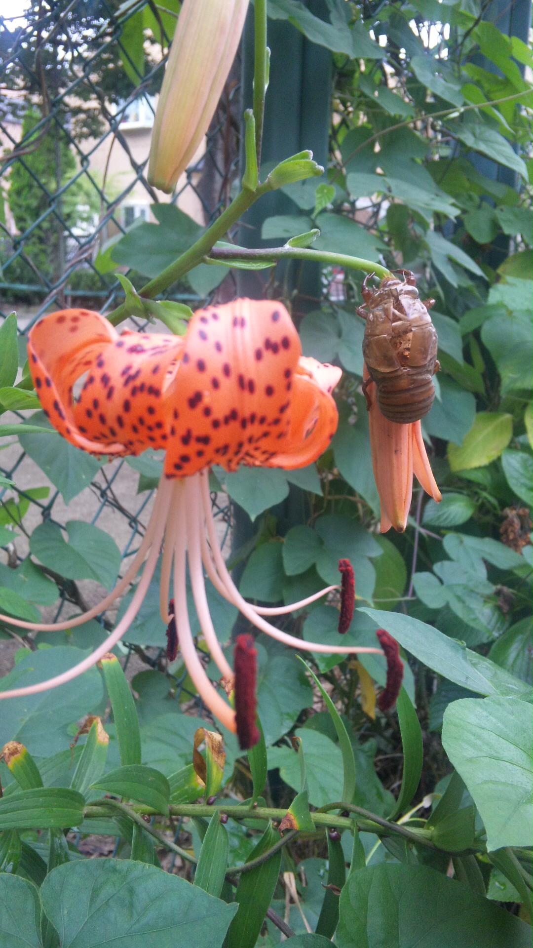 セミの抜け殻が、ユリの花にくっついてた!